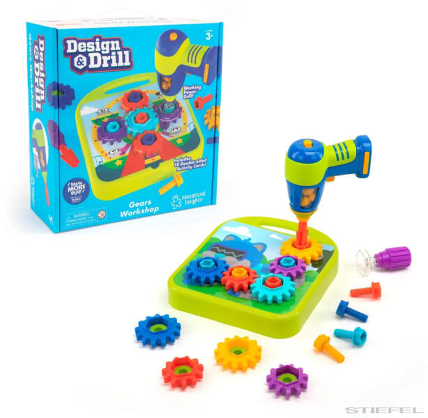 A kis mérnökök egy valósághűen működő fúrógépet, vaskos csavarokat és színes fogaskerekeket használnak a Design & Drill® Gears Workshop segítségével, hogy csavarodó, forgó láncreakciókat hozzanak létre, miközben fejlesztik finommotoros képességeiket.