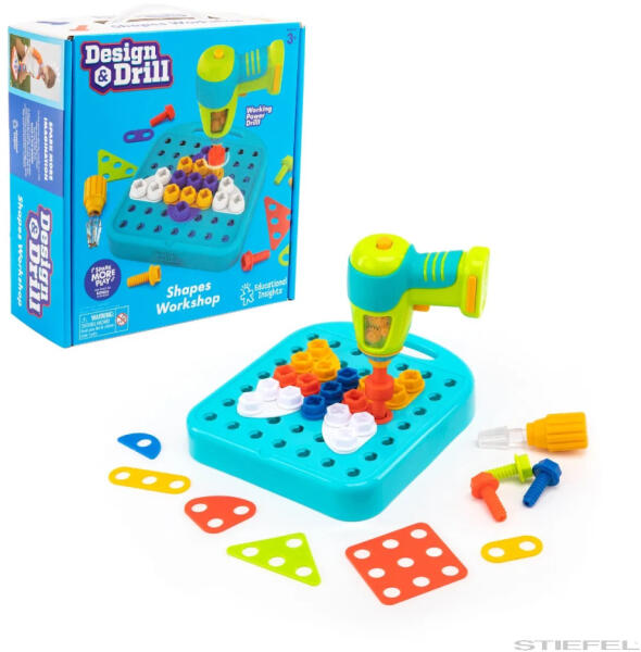 A szorgos építők egy gyerekbarát fúrógép játékkal, dekoratív tervezőlemezekkel és hozzáillő csavarokkal színes műalkotásokat hozhatnak létre a Design & Drill® Shapes Workshop segítségével.