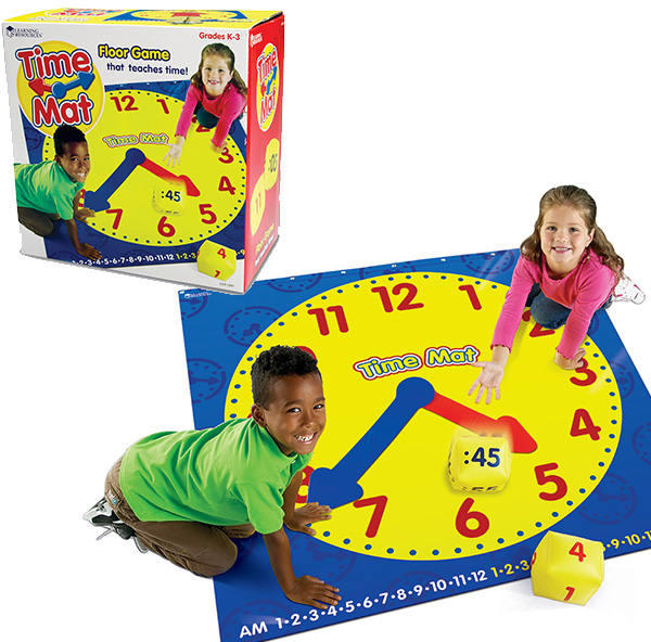 A gyerekek miután dobtak a kockákkal, beállítják az óramutatókat a kockákkal kidobott időt jelölve. A nagy játszószőnyeg számos további játéklehetőséget rejt az idő megtanulásához kapcsolódóan. A készlet magyar nyelvű játékleírással, ötletekkel és 20 aktivitás kártyával segíti a gyerekek tanulását. A négyzet alakú szőnyeg mérete 137 cm, anyaga PVC, fűzőlyukakksl ellátva, így könnyedén felhelyezhető a falra is. A felfújható kockák éle 13 cm. A játék fejleszti a matematikai készségeket, koncentrációt, a kis- és nagymotoros mozgást. Ajánlott 5 éves kortól.